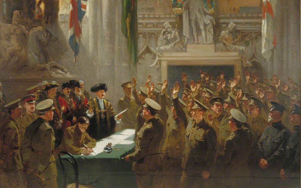 Fred Roe, Recruiting in the Guildhall, London (c. 1915) — A stirring scene of wartime enlistment in the heart of London, painted by the celebrated British historical illustrator.